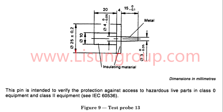 This Test Probe Pins (Figure 9 – Test probe 13 of IEC61032) is intended to verify the protection against access to hazardous live parts in class 0 equipment and class II equipment (see IEC60536).