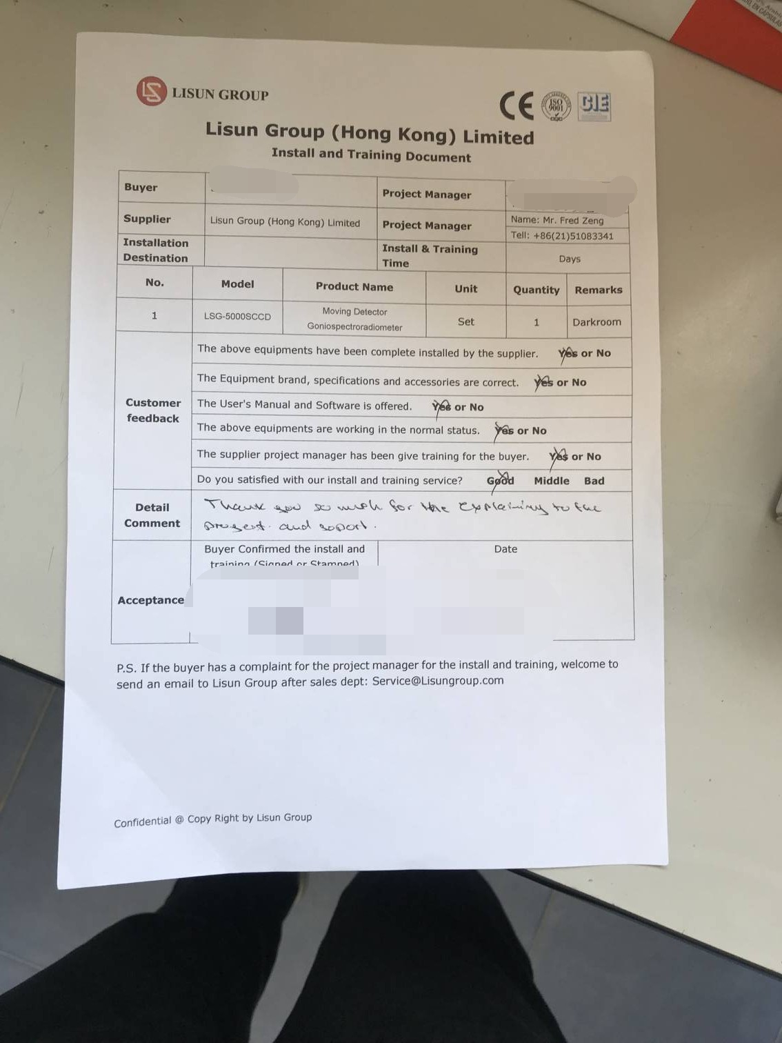 After the customer place the order, LISUN engineer designe darkroom drawings for them immediately to prepare the darkroom. After the customer received the equipment, we arrange engineer to assist in the installation and training as soon as possible. LISUN’s after-sales service is highly recognized by more and more customers, and we will continue to provide better equipment and better services for our customers! The following is a satisfactory form filled out by the customer: